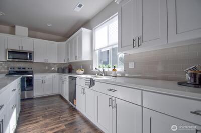 REDUCED PRICE! MOVE IN READY! Experience comfort and flexibility in this beautifully refreshed 3-story home in Phase 2 of The Landing at Spanaway Lake. Boasting 3,162 sq ft, this spacious residence offers 4 bedrooms, 3.25 baths, and a 3-car garage. Fresh interior paint and elegant 3CM slab countertops enhance the modern feel throughout. The well-appointed kitchen features stainless steel appliances, including refrigerator, stove, microwave, and dishwasher, and all appliances stay—including a new washer and dryer ready to install. The main level includes a versatile den and ¾ bath, ideal for guests or a home office. Upstairs, you’ll find a generous primary suite, three additional bedrooms, a full bath, and a convenient laundry room. The expansive third-floor bonus room with its own ¾ bath offers endless possibilities—perfect for a guest suite, media room, or game space. Enjoy the fully fenced backyard with attractive landscaping, a new 10x20 shed, and a playground nearby.