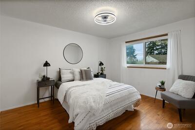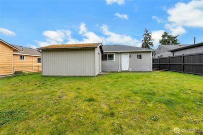 This single-story home is situated on a surprisingly spacious lot with an expansive backyard. Conveniently located near JBLM and I-5 this rambler offers flexibility and outstanding potential. Whether you are searching for your first home, looking to downsize, or adding to your investment portfolio, this property delivers both opportunity and location. The home includes a newer roof (2021), hardwood floors in the bedrooms, newer carpet in the living room (hardwood underneath), and an additional finished room with laminate flooring for added versatility. Triple-pane krypton-filled windows (excluding the slider) provide energy efficiency and comfort. Enjoy the covered front porch. The fully fenced yard offers space to garden, entertain, or play, and the detached shed provides excellent storage or workshop potential. Centrally located and full of possibilities, this is a home you will want to see in person.