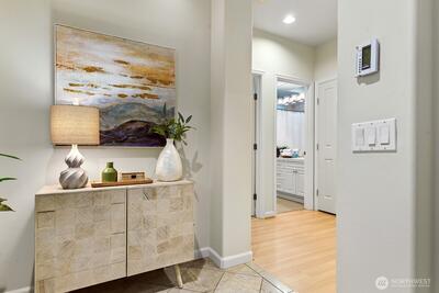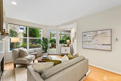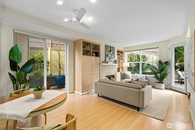 Welcome to Pacific Palisades! Ideally located between UW, Wallingford, Fremont, and Lake Union, this spectacular end unit offers high ceilings, beautiful tile work, and thoughtfully designed living spaces. The light-filled living room features expansive windows, a cozy gas fireplace, and serene views of the flowering garden patios, offering a beautiful backdrop of garden patio views. The thoughtfully designed kitchen opens to a welcoming dining area, perfect for both everyday living and entertaining. The spacious primary suite provides a private retreat with a walk-in closet, upgraded bath with bidet, and direct access to one of the expansive patios. Two private patios, accessible from the living room and bedrooms, offer exceptional space for relaxing, gardening, or hosting. Enjoy gated entry, two secure garage parking spaces, community exercise room and convenient access to restaurants, parks, the Burke-Gilman Trail, and light rail. City living feels refreshingly peaceful in this beau