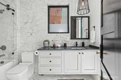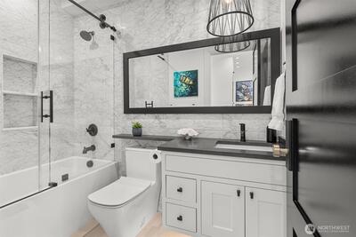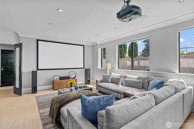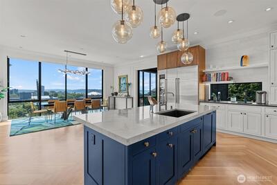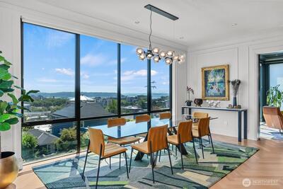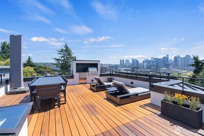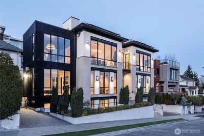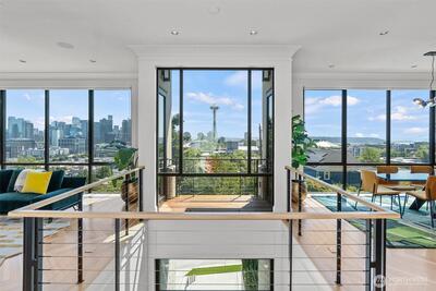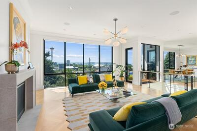 Elevated luxury in the heart of Queen Anne. Awaken with the sun over Seattle’s Emerald City & take in breathtaking, panoramic views of the Space Needle, skyline & Puget Sound from every level of this stunning 3-story residence. Designed for modern luxury, the home showcases soaring floor-to-ceiling glass walls, elegant contemporary finishes & cutting-edge smart home technology. Host unforgettable gatherings in the open-concept kitchen, living & picture-perfect dining spaces featuring rich hardwood floors, a striking fireplace & premier espresso, Sub-Zero & Wolf appliances—all set against awe-inspiring city & water vistas. Experience seamless indoor-outdoor living on a private, expansive rooftop deck with a fridge, BBQ, fireplace & wiring for a hot tub—the ideal place to savor Seattle’s sunsets for years to come. The primary suite's beautiful views pair with a dual-sided fireplace, patio, spa-inspired ensuite bath, wall to wall Carrera marble & heated floors. Unwind in your movi