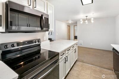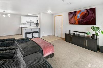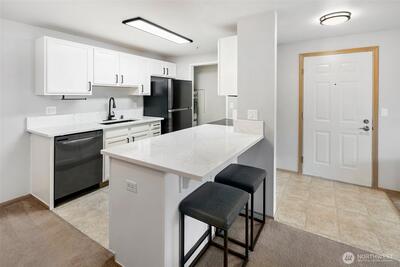 Tastefully updated and meticulously maintained top-floor condo offering comfort, convenience, and exceptional value! This light-filled home features an open-concept living and dining area, that feels spacious. The renovated kitchen shines with brand-new appliances, sleek quartz countertops, and ample cabinetry and prep space—perfect for everyday living and entertaining. The generously-sized primary suite provides a peaceful retreat and an updated en suite bathroom. The versatile second bedroom is ideal for guests or a home office. Step outside to your private balcony for morning coffee or evening relaxation. Plus a new water heater for piece of mind. Enjoy dedicated parking plus abundant guest parking—rare and convenient for visitors. The well-managed HOA keeps the community cared for while maintaining low monthly dues. Roof was replaced in 2025. Ideally located near shopping, dining, parks, transit, and major commuter routes including I-5, I-405, and light rail access. Offering ea