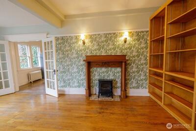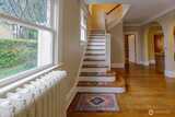 Start your day with coffee and pastry from the Wildwood Olympia Coffee and then wander back home to enjoy sitting on the back deck and overlooking your large, fenced lot with raised garden beds and the wrap-around porch of this piece of Olympia History. New bark and new gravel in the circular driveway. The Israel House was built in 1904 in the Foursquare American style with columns and wide porch and is on the historical register. Stepping inside to newly painted home with gleaming wood floors and unique nautilus leaded glass window in the front, you will find a fireplace with Batchelder tile surround, leaded glass in built-in hutch in the formal dining room, den/office (or parlor) with half-bath down. Bring your groceries home from Spuds to the warm kitchen with built-ins, butcher block countertops, dining nook, freshly painted cabinetry, and access to the back porch laundry area. Ascend the stately staircase to the upstairs featuring three bedrooms with fabulous built-ins, Large
