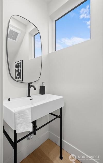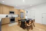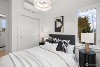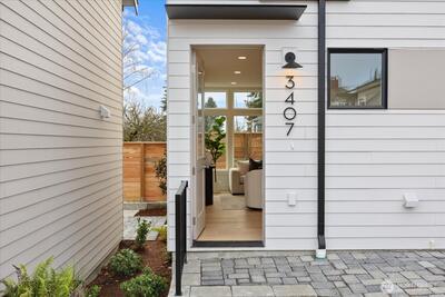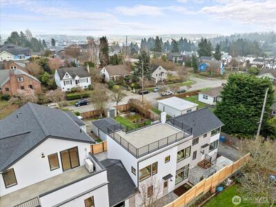 Luxury modern 2-story Sunset Hill ADU with panoramic rooftop sunset, mountain & city views—just 1 block to the beach. Part of a boutique collection, it lives like a free-standing SFR, with only one attached wall at the garage, and an oversized, heated, EV-ready garage with vaulted ceilings and exterior access. The open main level features white oak floors, lofty ceilings and designer finishes filled with natural light. Living and dining flow to a chef’s kitchen with Belmont cabinetry, quartz counters and stainless appliances plus patio access. Upstairs offers a serene primary suite, second bedroom and dual-vanity bath. 400+ SF rooftop deck captures breathtaking 360° views. Moments to Ballard Locks, Burke-Gilman Trail & Ray’s Boathouse.