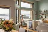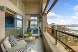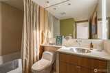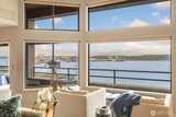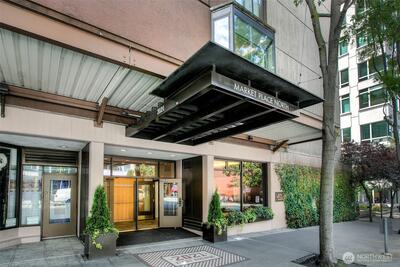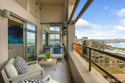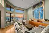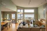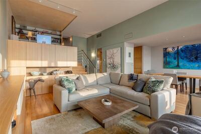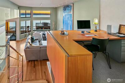 This exceptional residence overlooking Pike Place Market showcases unobstructed views of Puget Sound and the Olympic Mountains, delivering spectacular sunsets and ever-changing Northwest skies. Expansive windows flood the home with natural light, seamlessly connecting refined interiors to dramatic scenery. Thoughtfully redesigned and built-out by Krekow Jennings with premium materials, the home features engineered walnut plank flooring, solid walnut stairs, and wool carpet in the bedrooms and office. Custom bleached walnut cabinetry with nickel and stainless accents enhances the kitchen, living areas, and baths, complemented by granite countertops and backsplash and a suite of Sub-Zero, Miele, Wolf, and GE appliances. Both marble-clad baths offer heated floors, stone counters, and spa-inspired finishes, while the primary suite includes heated towel bars and integrated speakers. Modern comforts include central A/C with HEPA-filtered fresh air, recessed lighting with digital controls, an