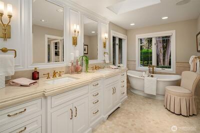 Experience refined, effortless living in this fully updated 5,415 sq ft Medina estate, perfectly positioned on a rare, level 21,587 sq ft lot. Designed with intention and ease, this 5 bedroom + den home lives primarily like a single-level residence, featuring a luxurious main floor primary suite and beautifully connected gathering spaces ideal for entertaining. The heart of the home is the exquisitely remodeled kitchen with high-end appliances, and seamless flow to the formal dining room and intimate sitting area. Honed wide plank flooring spans the upper level, bringing warmth and understated elegance throughout. Comfortable yet sophisticated, the home offers generous spaces to gather and unwind, including a game room, media area, flex room perfect for yoga or Peloton, wine cellar, and exceptional storage. Two additional en- suite bedrooms on the lower level provide private retreats for those seeking their own space. Car enthusiasts will appreciate the fully finished, “tricked-outâ