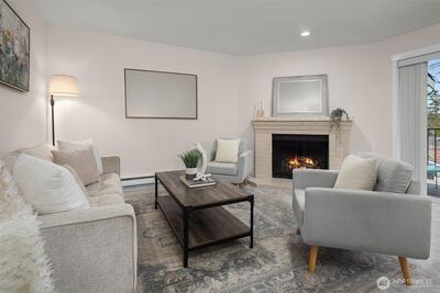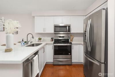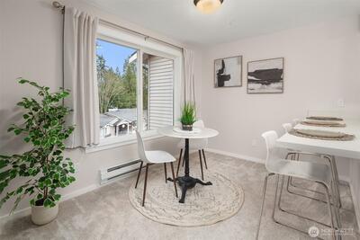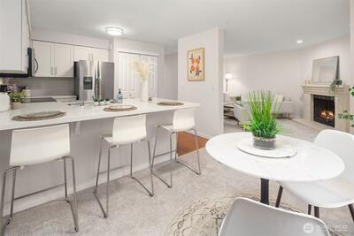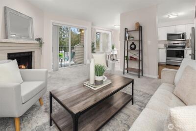 Updated top floor condo at Tanager offering style, comfort, and convenience! This beautifully refreshed home features new flooring, updated kitchen cabinets, updated bathroom, new carpet, and fresh interior paint throughout. The stunning kitchen showcases sleek quartz countertops with bar seating, stainless steel appliances, and a new stove - perfect for everyday living and entertaining. The spacious living and dining areas are filled with natural light and open to a private deck with peaceful territorial views, creating the perfect place to relax. Generous primary bedroom plus a well sized second bedroom provide flexible living options for guests or a home office. Full size washer and dryer and portable A/C unit included for added convenience. Includes two parking spaces. Ideally located with easy access to I-405 and just minutes to Park & Ride, Evergreen Hospital, and The Village at Totem Lake offering shopping, dining, and Whole Foods. Enjoy the quiet, well maintained communi
