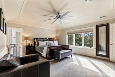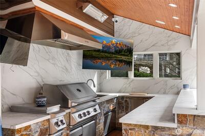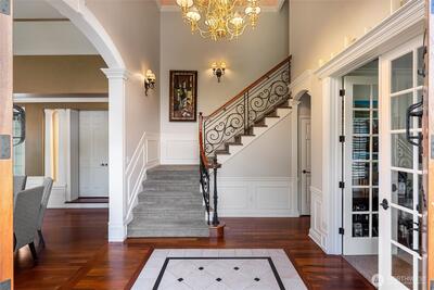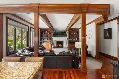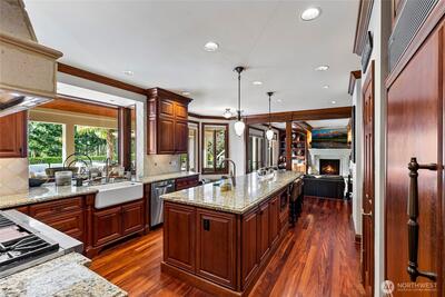 Rare private estate moments from Woodinville Wine Country! Extraordinary 4 bed, 4 bath, 6,400 sq ft home showcases over $1 mill in thoughtfully curated upgrades blending refined craftsmanship w/ resort living. Grand foyer welcomes you w/ Brazilian cherry floors & soaring ceilings, setting the tone for the home’s elegant interiors. Luxury kitchen, complete w/ fully appointed butler’s kitchen, anchors expansive living & entertaining spaces. Custom built-ins, executive office, & advanced electrical & whole home sound systems elevate both comfort & functionality. Highlights include wine fridge/storage room, along w/ a lower level mudroom. Upstairs spa inspired primary suite offers illuminated quartzite surfaces, custom stonework, instant hot water, dual wardrobes, & exquisite bath finishes. Upper level also includes theater room, game room, guest suites, private decks, oversized utility room, & flexible office space w/ Murphy bed. Designed for efficiency & ease, home includes 3 tankle