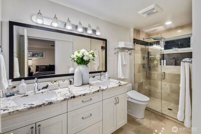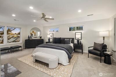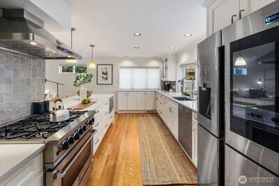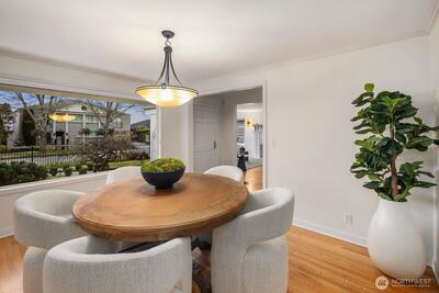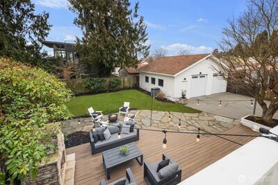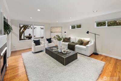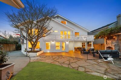Inside one of Magnolia’s most cherished pockets, this beautiful home blends generous spaces, comfort, and quiet luxury. Sweeping, power line free views of Mt. Rainier and the Seattle skyline unfold from the upper floors and rooftop deck. Fresh interior paint, professional landscaping, newer roof, seismic retrofit, updated electrical and plumbing, and efficient heating and cooling provide a solid, well-maintained foundation. Perfect hardwoods and new carpet elevate the interior. A picture window anchors the living room, complemented by fireplaces in the living and family rooms, primary bedroom, and basement. A main floor bedroom and ¾ bath offers easy, no stairs access for multigenerational living. The large basement—with a full bar, ice maker, dishwasher, and entertaining space—sets the stage for movie nights or game day gatherings. The spacious backyard is ideal for multi-season entertaining, and fireside evenings. An attractive iron fence and automated gate secure the driveway