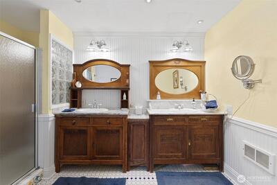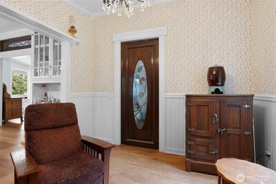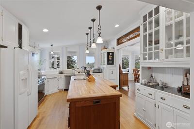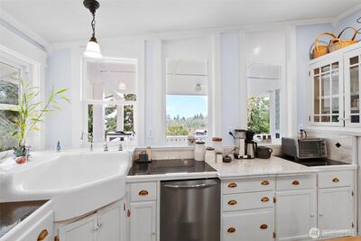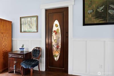 Chehalis Valley charmer with a bonus lower-level apartment and 832 SF studio! Located just 2 miles from I-5 on a paved dead-end road with valley views, this fully remodeled home showcases exceptional craftsmanship, rich woodwork, and custom stained glass throughout. The living and formal dining area features vaulted ceilings, large windows, wainscoted walls, a double-sided propane fireplace, and access to a covered porch. The bright kitchen offers abundant storage, beautiful marble counters, and a large butcher block island with outlets. Off the kitchen, the parlor includes a functional antique wood cook stove and a custom stained glass pocket door. Down the hall are a full bath with bidet, secondary bedroom, and stunning primary suite with cork flooring, walk-in closet, a tiled bath with antique double vanities, clawfoot tub, and separate shower. The lower level includes a third bedroom, office, and mechanical room with lots of storage. The finished apartment has interior and exterior