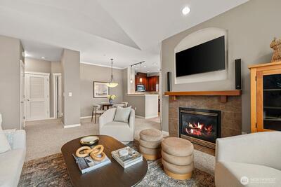 Perfect location! Jacobs Creek is one of Sammamish’s most sought-after gated communities! This desirable 2-bedroom end-unit home offers effortless one-level living with an attached garage plus driveway parking. The spacious open floor plan is filled with natural light from oversized windows and vaulted ceilings, creating a bright and inviting atmosphere. Enjoy peaceful territorial views from the great room, which flows seamlessly into the updated kitchen featuring solid wood cabinetry, slab countertops, stainless steel appliances and a sit-up breakfast bar. The dining room includes a built-in buffet, perfect for entertaining and storage. Step outside to the private, covered deck, ideal for year-round relaxation and enjoying the serene setting. The primary suite includes an en-suite bath, fireplace and walk-in closet, while the oversized second bedroom with terrace offers flexibility for guests, office, or hobbies. Community amenities include a P-Patch garden, walking trails, and BBQ