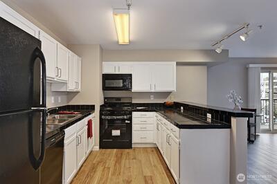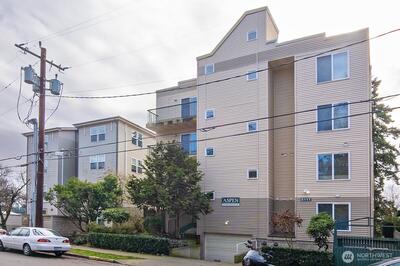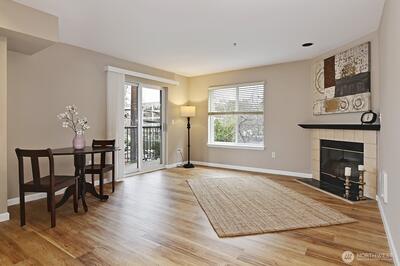 Don't miss this wonderful opportunity just half mile from the I-5 foot path overpass to Northgate Light Rail Station and Kraken Community Iceplex! Freshly painted, new flooring & appliances, and ready to move in 2 bedroom/2 bath condo! Spacious kitchen with breakfast bar opens to living room with gas fireplace and private deck. Elevator access, secured parking, storage unit, pet friendly, rental friendly, and more. Roof replaced with a PVC membrane roof in 2020. HOA includes Water/Sewer/Natural Gas/Garbage & common area maintenance.
