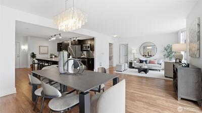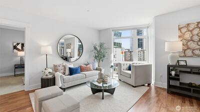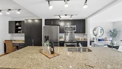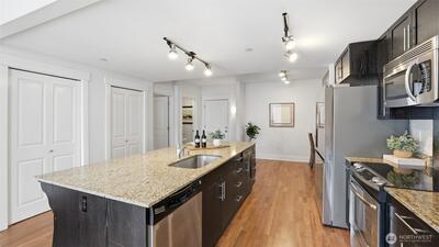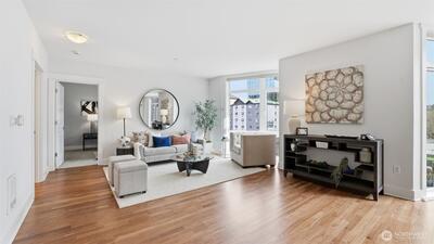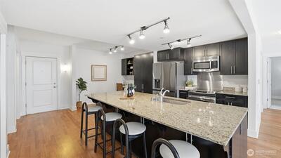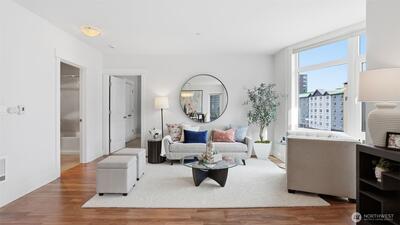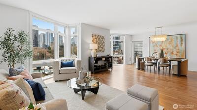 W I D E...O P E N...Not your average condo...Step through the front door to a greatroom style kitchen you would expect to find in a 5,000 sqft house. Centering the residence is a 4' x 9' kitchen island with slab granite counters, expansive cabinets, storage & prep space. Enjoy city views & ample natural light from the floor-to-ceiling windows which cantilever over a tree-lined boulevard. Brilliant floorplan with newly refinished walnut floors, bedroom "wings" on either end of the living & dining area includes an owners suite with huge walk-in closet & attached bathroom with frameless walk-in shower. Epicenter location where Belltown, Queen Anne & SLU meet; you are only a couple blocks from Seattle Center, Space Needle, Apple, Amazon, Meta & Google. Two secured garage parking spaces, storage unit & lobby entry. Amenities include a gym & yoga studio, 3 rooftop view decks with BBQ, pet-relief area & community lounge. Prime investment with on-site property manager & no rental cap.