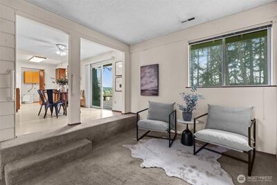 Imagine mornings on your deck with view of the water, Mt Rainier and the quiet feel of island living just minutes from town. This Raft Island rambler offers space, privacy, and potential. Priced for your vision, an incredible opportunity to build equity with a view and community beach access. Enter through the covered patio into a cozy living room centered around a wood burning fireplace. The open flow from the living room to the breakfast nook, to the expansive 180 degree deck beyond the kitchen creates a space for entertaining or unwinding at the end of the day. Three bedrooms plus a flexible den provide options for a home office, bonus room, or creative space. The home is ready for your design ideas to create your own primary retreat, vacation home, or investment property. The opportunities are there to make it your own! Raft Island is a sought after community offering residents private beaches, boat launch, dock, kayak storage, tennis court, and parks. Spend your weekends kayakin