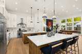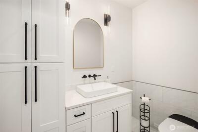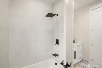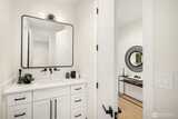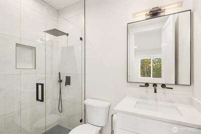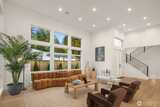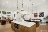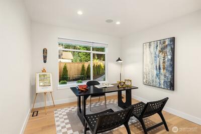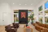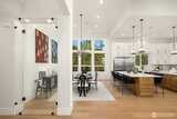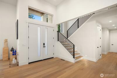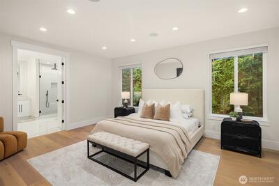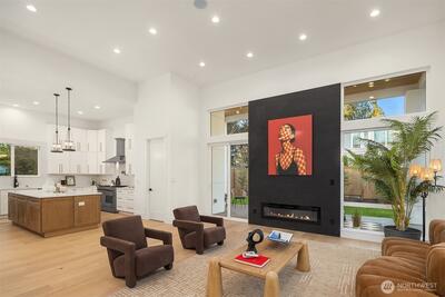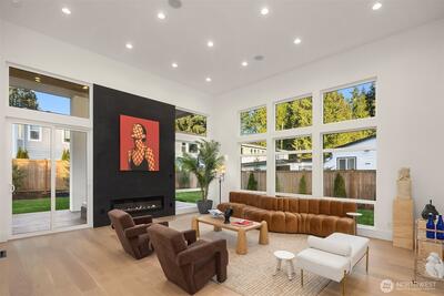Striking new construction in the heart of highly sought-after Bridle Trails, this 4,160 sq ft modern residence blends clean architectural lines with warm, livable design. Thoughtfully crafted with premium materials and impeccable attention to detail, the home offers an ideal balance of sophistication and comfort. The open-concept main level is anchored by a dramatic great room with soaring ceilings, walls of windows, and a sleek fireplace feature. A designer kitchen showcases custom cabinetry, oversized dual islands, high-end appliances, and seamless flow to the dining and living spaces—perfect for entertaining at scale or everyday living. Indoor-outdoor living is effortless with covered patio spaces overlooking the private, landscaped grounds. Upstairs and beyond, the home offers generously sized bedrooms, spa-inspired baths, and flexible spaces ideal for a home office, media room, or guest retreat. The primary suite is a true sanctuary, featuring a luxurious bath with freesta