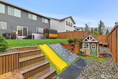 Exceptional Mount Si Views and Resort-Style Living in Maloney Estates. Built in 2023, this 3,540-square-foot home seamlessly blends Craftsman design with high-end modern finishes. Located at the base of the Cascade foothills in Maloney Estates, the property offers immediate access to the region’s best hiking trails and breathtaking, 180-degree views of Mount Si right from the backyard. The outdoor space is built for both recreation and relaxation. The fully fenced backyard features a private heated pool and an on-site sauna, offering premium amenities at home. The landscaping remains lush and low-maintenance year-round, supported by a built-in sprinkler system. Inside, the open-concept layout is bright and highly functional. The heart of the main floor is a chef-inspired gourmet kitchen equipped with an oversized eating area that flows directly into a large family room anchored by a gas fireplace. The main level also offers a quiet, secluded den serving as an ideal home office, alon