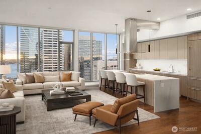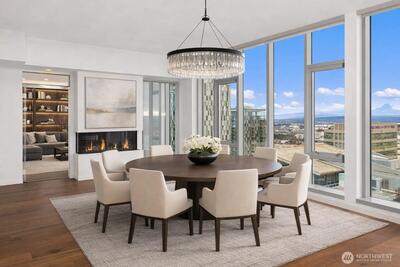 Offered for the first time ever, Penthouse 3602 atop Graystone – one of only four penthouses crowning First Hill’s Modern Classic. Positioned on the coveted southwest corner, this 2 Bedroom + Den residence spans 2,047 sqft with 11+ ft ceilings and walls of glass framing front-row views of Mount Rainier, the city skyline, and Elliott Bay. Designed for elevated living and effortless entertaining, the chef’s kitchen features Wolf & Sub-Zero appliances, built-in wine storage, and a grand waterfall island. A gas fireplace anchors the living room, while the primary suite offers spa-inspired comfort, an expansive walk-in closet, and unforgettable vistas. Penthouse 3602 presents a rare blank canvas ready for your design vision. Graystone, named 2025 Development of the Year, sets the standard for new construction high-rise living in Seattle. Residents enjoy a panoramic rooftop club, fitness center, and 24/7 concierge – all in one of Downtown Seattle’s most historic and preferred neigh