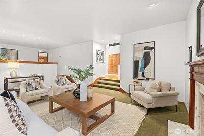 Conveniently located in Bellevue near tech centers, yet private and secluded. Soaring ceilings and architectural windows frame stunning views of the evergreen canopy, bringing natural beauty into every room. A sensible layout offers flexibility and function for everyday living. The main floor flows seamlessly from the open living and dining rooms to a cozy family room. An eating nook and laundry room sit just off the kitchen for added ease. A generous entertainment deck stretches from the family room to the dining room, immersing you in the peaceful setting. A dedicated office near the entry adds versatility. Upstairs, the home becomes a true sanctuary. The spacious primary suite offers comfort and serenity with a warm fireplace and private deck overlooking the grounds. Three additional bedrooms and a full bath provide ample space for guests, work, or play. Set on a shy acre, the property offers room to entertain and explore in remarkable privacy. Lovingly maintained by one owner since