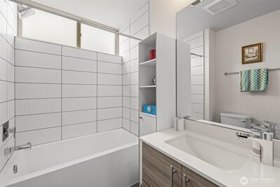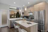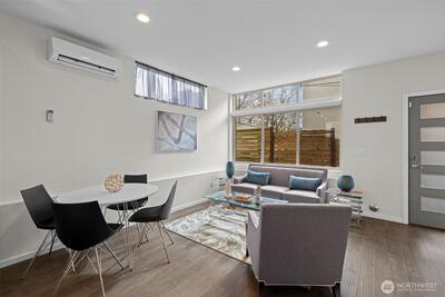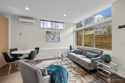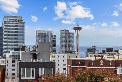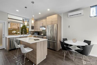 Perched in the heart of Capitol Hill, this stunning modern residence blends sophisticated design with iconic Seattle views! This light-filled 3-bedroom, 2.5-bath home offers 1,260 square feet of thoughtfully designed living with an open-concept layout and seamless indoor-outdoor flow. The main floor features a sleek chef’s kitchen with high quality stainless appliances, gas cooking, quartz counters, tile backsplash, generous island and abundant cabinetry that opens to a tranquil, fenced, private garden patio-an inviting retreat for morning coffee or quiet evenings. Spacious living and dining spaces offer an inviting ambiance and premium hardwood laminate flooring throughout enhances the home’s warm, modern aesthetic. Two spacious bedrooms and a beautifully appointed full bath occupy the second level, while the top-floor primary suite offers a spa-inspired retreat with oversized walk-in tile shower and quartz vanity. Above it all, the expansive rooftop deck captures breathtaking v