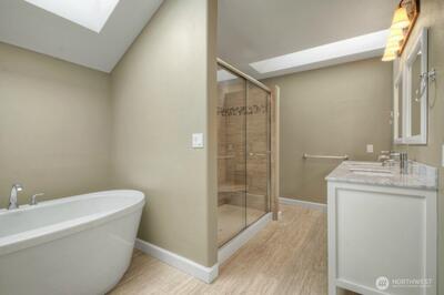 4-bedroom potential + ~500 SF additional space. Featuring two fireplaces, NEW gas range, and private backyard with RV parking. in a charming Nottingham home, perfectly nestled in a friendly, well-maintained community. Freshly redone landscaping enhances curb appeal, and the home is within walking distance to Olympia High, Middle, and Elementary schools. Large rooms throughout include a huge family room with built-in entertainment center, bright living and dining rooms with bay windows, and a formal living room with a beautiful cast iron gas fireplace. Hardwood and porcelain floors, granite countertops, skylights, and natural gas heat with AC add comfort and style. Upstairs offers three bedrooms plus flexible finished areas, including a bonus/family room with closet and door—perfect as a potential fourth bedroom—an extended bedroom nook, and a finished attic for storage, office, or hobbies, as well as amazing views from the well-appointed loft office. Enjoy a private, fully fenced b