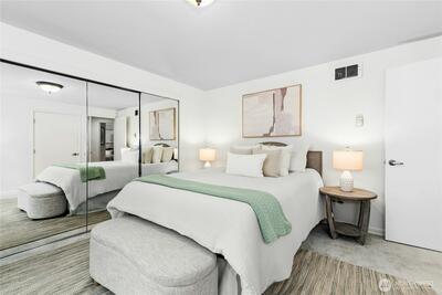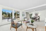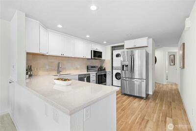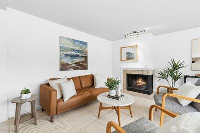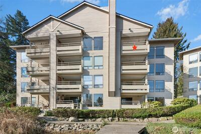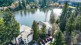 Top-floor corner retreat with elevator access, stunning lake views, and nearly 1,100 SF of beautifully updated living space! This light-filled 2-bedroom, 1.5-bath condo offers added privacy and comfort, featuring a spacious living room with a cozy fireplace and expansive picture windows that frame the serene setting. A large dining room provides the perfect space for gatherings, while the well-sized bedrooms offer flexibility and retreat. Fresh paint, new flooring, updated lighting, and a beautifully remodeled kitchen with modern finishes make this home truly move-in ready. Step onto your private deck to enjoy peaceful lake views, plus take advantage of elevator access, covered parking, 2 private docks for lakeside relaxation and a boat launch. Ideally located near shopping, restaurants, light rail, bus lines, and freeway access, with a well-run HOA for added peace of mind.