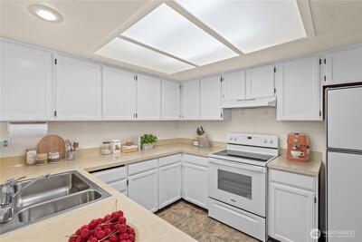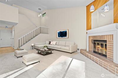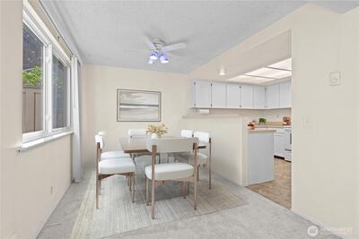 Amazing location and meticulously maintained three bedroom two bath townhouse style condo in beautiful Kent Shires. Open concept plan with high vaulted ceilings and plenty of natural lighting. Back door patio opens to large green common area. Attached two car garage and storage space. HOA maintains lawn, common areas and building exterior. Sewer and water included in monthly dues. New roof and carpet February 2026. Across the street from the new YMCA, close to schools, shopping, restaurants, parks, transit and Kent Station. Move in ready, low maintenance, unbeatable value! Pets are OK and subject to restriction.