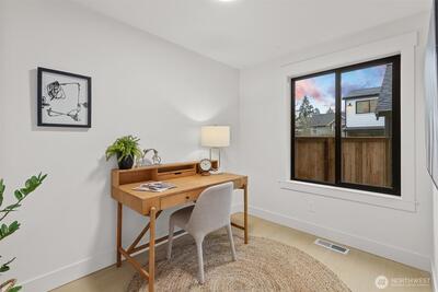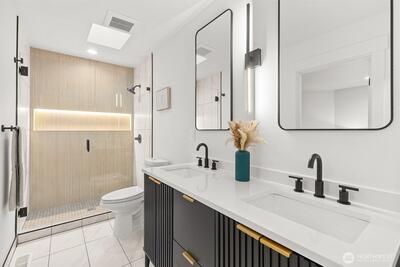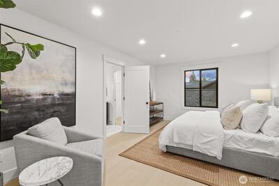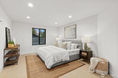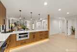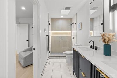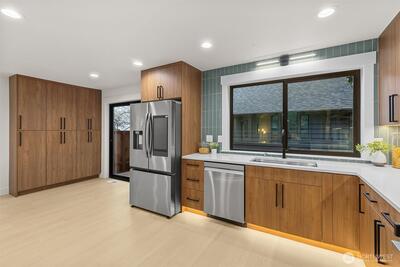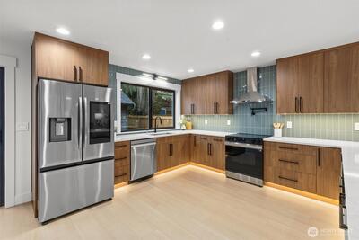 This is your chance to own a 3 bed + office, 2.5 bath fully renovated home with a 2-car detached garage located in a pocket of Olympic Hills known for block parties, Halloween celebrations, and genuine neighborly connection. Perched up on a quiet residential street, this house has everything to offer! Modern design with a Northwest vibe featuring whole house wide-plank LVP flooring, a massive kitchen perfect for entertaining with walnut dovetail soft-close cabinetry, Samsung stainless steel appliances with smart refrigerator, Peninsula microwave, and a pot filler. Additionally, under-cabinet, toe-kick, and shower niche LED lighting adds warmth and dimension to every room. The upper level of the home offers three spacious bedrooms including the primary suite with a walk-in closet and a tastefully designed spa-like bathroom with heated tile floor and bidet for added comfort. Central heating and cooling with new furnace and A/C, new hot water tank, and a digital water meter provide effici