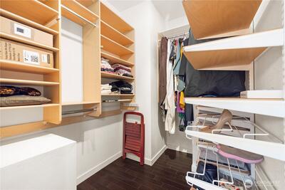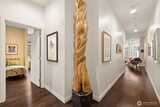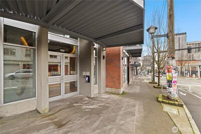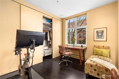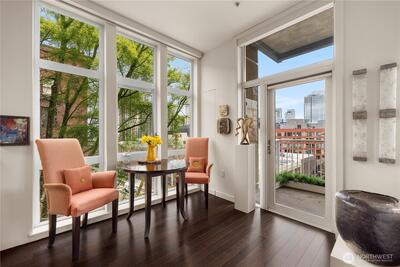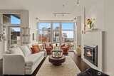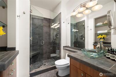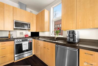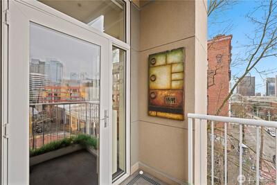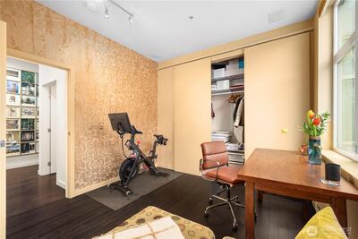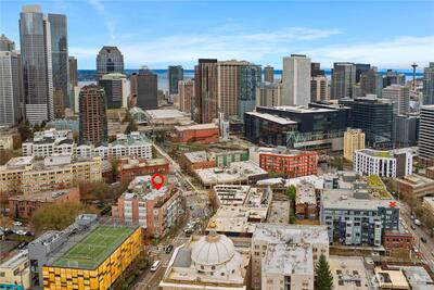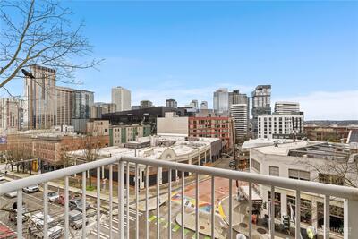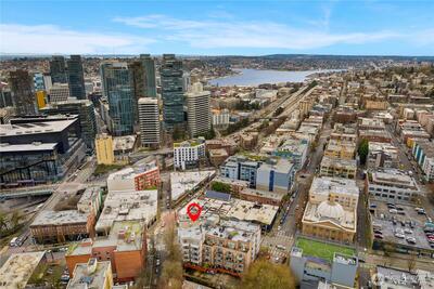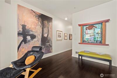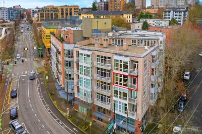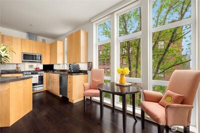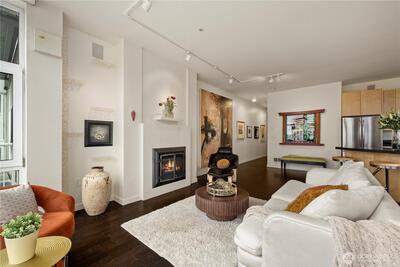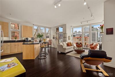 Incredible spacious 5th floor home with vibrant Seattle Skyline views! Sophisticated, sexy, sleek, modern loft style home. Corner end unit with windows on 2 sides, for wonderful light and cross breezes. Enormous windows and 9+ foot high ceilings create a gallery-style space. Generous, open living. Stunning espresso stained hardwood throughout. Gorgeous kitchen with Dogpaw Design concrete, newer appliances (LG ThinQ gas range with air fryer, beverage fridge, GE profile fridge, Bosch dishwasher, full size LG stack W/D with dry cleaning feature). Fantastic quiet neighborhood. Lavish primary suite with fantastic walk-in closet, fabulous subtle hand painted wallpaper and electronic black out shades. Primary bath features Italian ceramic, pebble floors, shower niches, 2 headed shower. Newer White Haus dual flush toilet. Designed and built as a 2 bedroom, owner removed a wall for one stunning open concept bedroom suite with office space and room for exercise. Yacht doors conceal flat screen T