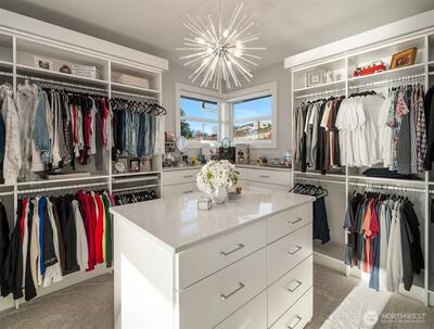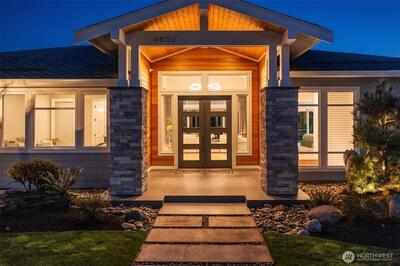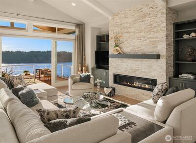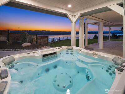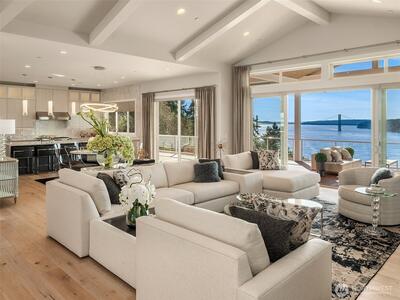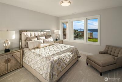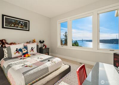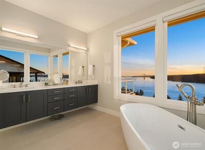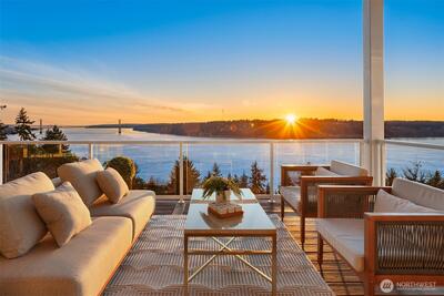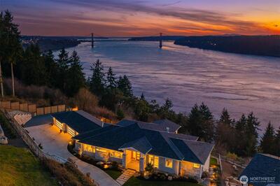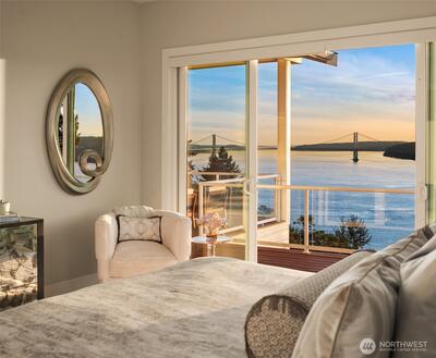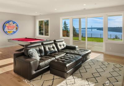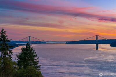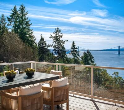 Welcome to the pinnacle of North Tacoma living. The WOW factor of this 2022-built home is second to none. You’ll wake up every day in awe of the Tacoma Narrows, Olympic Mountains, and the view into the heart of Gig Harbor. Your guests will arrive at the front door, and their jaws will drop at the panoramic West-facing view. You’ll park in the immaculate four-car garage with polished concrete floor, and your stress will melt away. The open concept main living room features vaulted ceilings and walls of glass leading out to the expansive view deck with heaters in the tongue-and-groove ceiling. Envision breaking bread with those you cherish the most in the spotless like-new kitchen. The main level primary wing offers a seamless flow from the bedroom to the spa-like bath, into the generous primary closet with access into the pristine laundry. With four additional bedrooms, two on main and two on the daylight lower level, there is space for everyone. The lower-level living room features