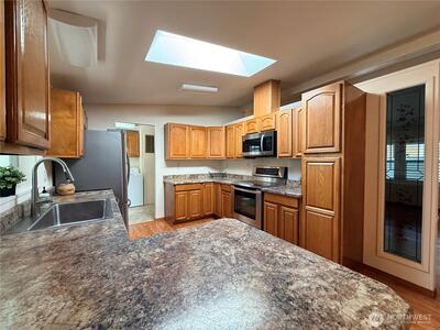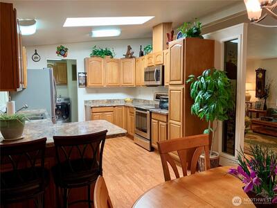 Beautiful 3 bedroom home in popular 55+ community in Alonda Villa Park! Features open concept, vaulted ceiling, skylight, separate family room with cozy pellet stove. Kitchen shows great with custom oak cabinets and countertop, eating bar, laminate wood floors, and stainless steel appliances. Home has been totally remodeled, it's in immaculate condition. 30 year roof installed, and vinyl windows throughout. Large carport with storage building, heat pump/ AC. Patio in backyard backs up to trees, and feels private. Close to shopping, dining and medical facilities, with easy access to I-5! Lot rent includes: water, septic & garbage. A must see!