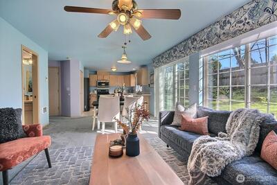 Welcome to the Lakes, a peaceful townhome community in Kent. This rare find lives like a single-family home, boasting the convenience of a private, attached 2-car garage, and an interior defined by a simple, classic design. As you step in from the charming covered front porch, you are greeted by an expansive formal living room featuring soaring vaulted ceilings and a cozy fireplace, creating an immediate sense of airy openness. The layout flows effortlessly into the heart of the home: a light-filled, open-concept kitchen and a spacious second living area. In the, kitchen you'll enjoy a smart fridge, newer stove, a generous pantry, and a versatile peninsula with breakfast bar seating. The adjacent second living space, is the ultimate in convenience and privacy with remote, motor-controlled blinds. An inviting dining area sits by the sliding glass doors, which open to your outdoor patio space. Experience a "touchless" lifestyle with hands-free, sensor-activated fixtures, faucets, and to