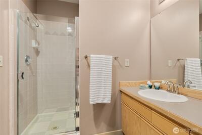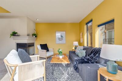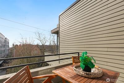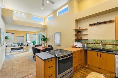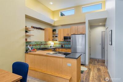 Rarely available top-floor residence at Stanton Court, a boutique Capitol Hill building just off the vibrant 15th Ave E corridor. Nearly 1,000 sq ft of light-filled living space defined by soaring ceiling height and clerestory windows that draw natural light deep into the home and create a striking architectural volume. French doors open to a south-facing deck overlooking the neighborhood rooftops. The kitchen is thoughtfully updated with custom cabinetry, concrete counters, and stainless appliances, blending warmth and function. Two bedrooms and 1.75 baths offer flexibility for guests, office, or studio space. Secure garage parking and large storage included. Outside your door, the best of Capitol Hill unfolds with Volunteer Park, the Seattle Asian Art Museum, Cantinetta, Victrola Coffee, Creature Consignment, The Shop Agora, Ada's, and many other acclaimed shops and restaurants just moments away.