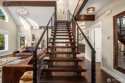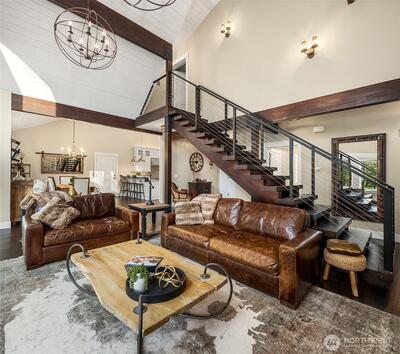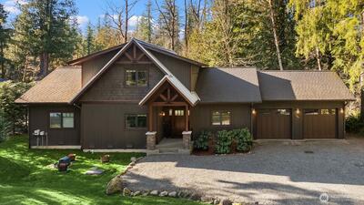 Experience the unparalleled privacy and natural beauty of Moon Valley, nestled at the base of Mount Si and one of North Bend’s most coveted neighborhoods. Tucked along 75 feet of the North Fork of the Snoqualmie River, this custom built home offers a rare combination of seclusion, riverfront living, and modern Pacific Northwest design. Built just eight years ago by the owner with lasting quality and thoughtful craftsmanship in mind, no detail was overlooked. Vaulted ceilings, exposed beams, and a dramatic open staircase define the home’s architectural character, while expansive windows frame serene river views and flood the interior with natural light. A gas fireplace adds warmth and ambiance to the main living space. The kitchen features marble countertops, high end cabinetry, and premium appliances, crafted for both beauty and everyday functionality. The home also includes a spacious two car garage. Mature hedges and established landscaping provide exceptional privacy and complem