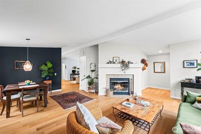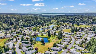 Turn Key and Gorgeous! Welcome to the Lakes, a 55+ community where convenience of the Gig Harbor North location meets the tranquility and ease of living in this remodeled upscale home. Spacious, open concept and with lots of natural light, this home features a large kitchen with quartz counters, two living areas with engineered hardwoods and cozy wood burning fireplace, a large primary suite offering an updated bath with marble counters, generously sized shower and lounging area. The secondary bedroom is great as is or a den/work out or craft room. Redesigned, the backyard features a large seating area with remote awning, raised flourishing garden beds, 4 varieties of apple trees, 2 pear trees and fig trees. The 3 car garage has an EV Level 2 charger! The community offers lakes throughout the property, 25 acres of sprawling greenbelts and walking trails right along the lake, community Clubhouse which has recently been updated and is available for a private parties and community activ
