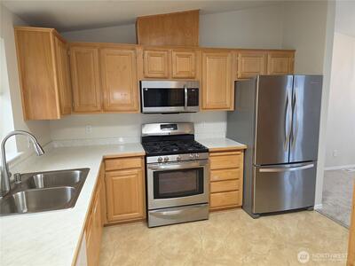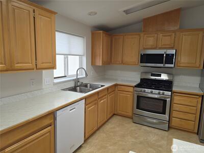 Welcome to Lake Wilderness Villa, a premier 55+ gated community in Maple Valley. This beautifully maintained neighborhood offers an exceptional blend of comfort, style, and an active social lifestyle, with convenient access to local shopping, the Lake Wilderness trails and much more. We are pleased to present this updated and bright three-bedroom, two-bathroom home. The interior features an open great room concept with cathedral ceilings, skylights, and a dedicated dining area. The spacious, bright kitchen is equipped with a breakfast bar, ample counter space, and all necessary appliances. In the primary suite, you will find a walk-in closet, double vanities, a Jacuzzi jetted soaking tub, and a separate shower. For added convenience, the home includes forced-air gas heat and A/C, a utility room with built-in storage, and a finished, oversized two-car garage (extra long). Outside, the property features a covered patio with and a fenced yard and dedicated garden space. As a residen