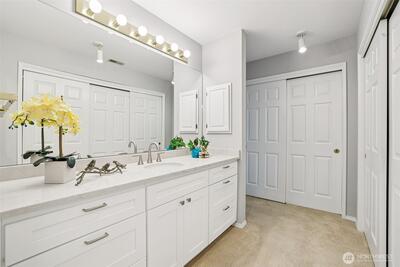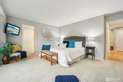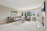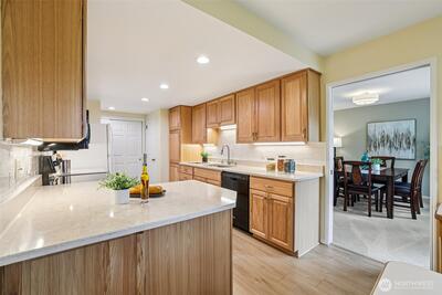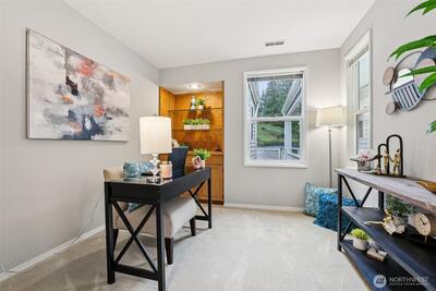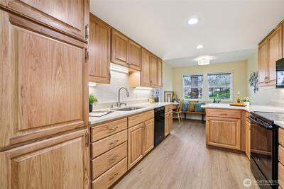 Charming Upper Corner Condo in Hilltop Village of Providence Point an exclusive 55+ private gated community in Issaquah, WA. This rare 2-bedroom condo WITH A DEN offers zero stair access, making it perfect for easy living. Scheduled for updates in 2027, the building will feature new siding, fresh exterior paint, and a revamped walkway to the front door. Inside, you’ll love the modern touches—updated kitchen and bathrooms, beautiful newer flooring, and a TRANE furnace paired with a heat pump for cool summer comfort. The spacious primary bedroom boasts multiple windows, providing stunning views of the serene grassy hillside. Enjoy the luxurious primary ensuite bathroom, complete with multiple closets, newer cabinetry, hard surface counters, and a stylish shower with a glass enclosure. The kitchen is a chef’s delight, featuring a charming built-in dinette nook with seating and a desk, along with newer cabinetry, counters, sink, and microwave. The versatile third room, equipped with