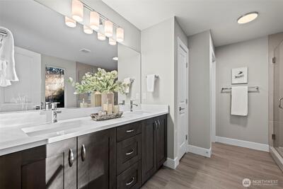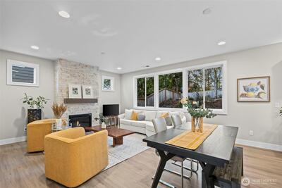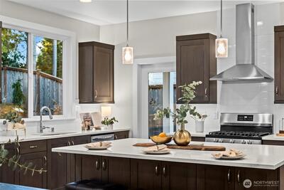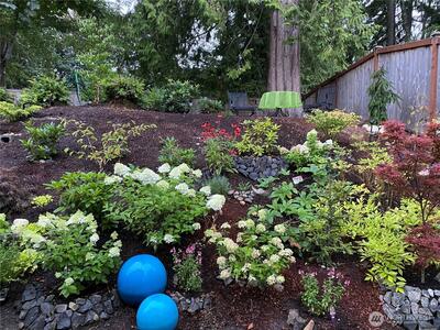 Discover a "better than new" treasure by Rush Construction, where a passion for detail meets a masterfully curated landscape in the heart of The Heritage at Gig Harbor. Completed in 2022 and maintained with rare, painstaking precision, this 2,416 SF residence has been transitioned from a pristine new build into a true living sanctuary. The soul of this home is found in its enchanted grounds—a private, park-like retreat featuring a sophisticated collection of over 250 carefully selected plants; Japanese Maples, Dogwoods, flowering shrubs and fruit trees. With more than 200 carefully placed bulbs, the garden is designed to offer a new tapestry of blooms throughout every season. Subtle landscape lighting ensures this peaceful escape remains a focal point well into the evening, with western exposure filtered through mature, protective trees. Inside, the light-filled great room offers a sense of quiet seclusion, while the versatile floor plan features a sought-after main-floor bedro
