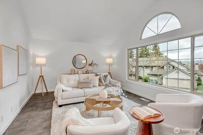 Welcome home to Walnut Hills, a desirable townhome community on 6+ acres, surrounded by nature in a PRIME Redmond location. Set among professionally maintained grounds, this fully remodeled 2 bed, den + 2.5 bath home offers a bright, open layout with vaulted ceilings and abundant windows showcasing majestic Cascade mountain and territorial views. Thoughtful updates throughout include a redesigned Chef's kitchen and baths with quartz countertops, custom tile, new lighting, fixtures, SS appliances, and fresh interior paint. The kitchen flows seamlessly into the great room and out to a private fenced patio, perfect for gardening, dining...pets and everyday living. The spacious and SERENE primary en'suite is simply beautifully sized and features French doors and a well-appointed 5-piece bath with double sinks, soaking-jetted tub, custom tile, walk-in shower + walk-in closet. The two-car garage has ample storage plus lots of guest parking and a TALL crawl space for storing those boxes and s