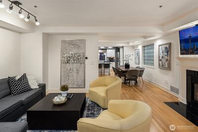 Sweeping views of Lake Union, Downtown, & Cascades can be enjoyed on four levels in this stunning end-unit townhome high on the east slope of Queen Anne. Natural light moves throughout the home & open-concept main living area is perfect for entertainment. Terraces on each level, including a spectacular rooftop area with sublime 180 vistas. High-end kitchen features stainless appliances, large pantry & expansive bar. Owners’ suite has private balcony & 5-piece spa-like bath with a jetted tub; 2nd guest bedroom w/ ensuite bath. Large top-floor bedroom has a dramatic vaulted ceiling, wet bar, & is exceptionally bright. Bonus home office/workout area w/ private patio + rare attached 2-car garage. Walk to vibrant SLU for work, shops, & dining.