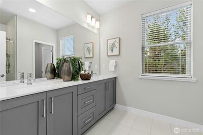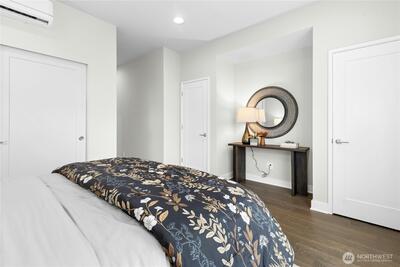 Welcome to Vareze Townhomes in Kirkland! This 2020 Tri Pointe resale offers a small community feel with shared green space, pavilion, and sidewalks, yet just minutes to Totem Lake Village (8 mins), I-405 (2 mins), and Juanita Beach Park (5 mins). Entry level features a tandem 2-car garage with EV charging and flex space perfect for an office or gym. Main level showcases tall ceilings, open-concept living, a large quartz island perfect for entertaining, KitchenAid stainless appliances w/ gas cooking, powder room, and 2 outdoor decks (one covered). Upstairs you’ll find a spacious primary suite with oversized en-suite bath with dual vanities and private water closet, second bedroom en-suite with full bath, and laundry. Mini-splits for year-round comfort! Pet-friendly HOA with no rental cap. Pre-inspected for peace of mind.