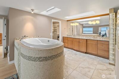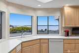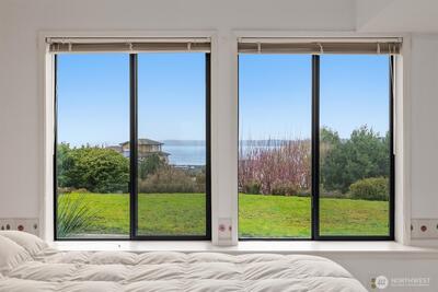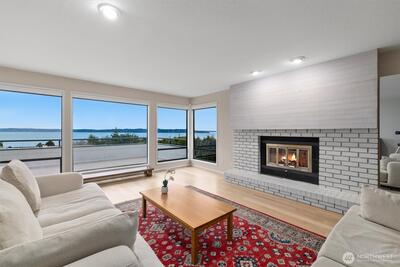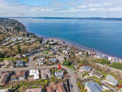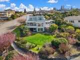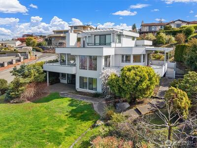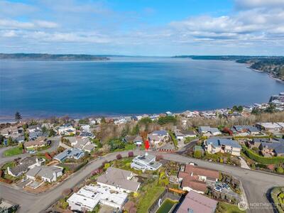 Imagine Puget Sound sunsets across your sweeping view of the sound from your private stately residence. Situated on a winding corner lot sitting high above the neighboring homes this jewel of Marine Hills commands your admiration. Spread across three levels, this home features three bedrooms including a full top floor birds nest primary suite with huge en-suite and unique central jetted tub sure to catch the water view white you relax. Main floor offers a large living room with solid natural oak wood floors, anchored by an inviting gas fireplace and an open kitchen with both a formal dining room and a cozy eat-in breakfast nook all surrounded by a wrap around deck sure to take advantage of year round wildlife and water watching. Large 1/3 acre lot with mature landscaping sits high above the street for privacy with both a flat grassy area for activities or lounging and partitioned terraces for gardening and flora. Spacious 2 car garage and A/C! Optional membership to Marine Hills swim a