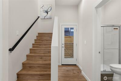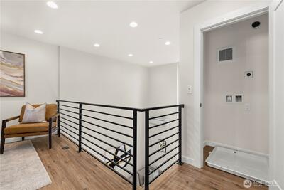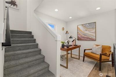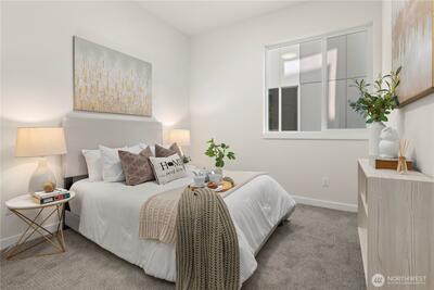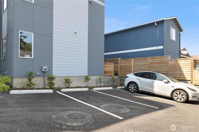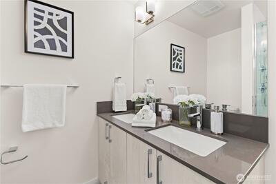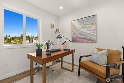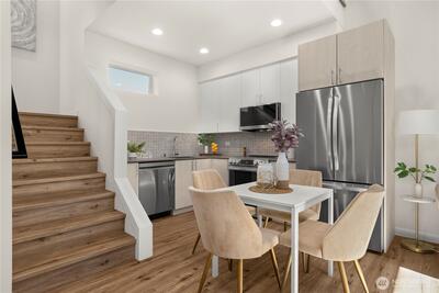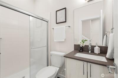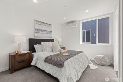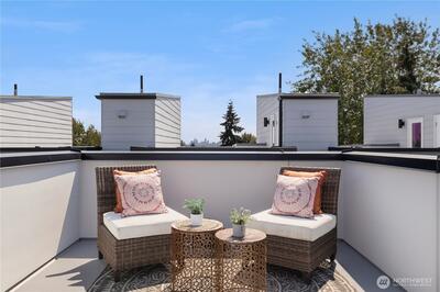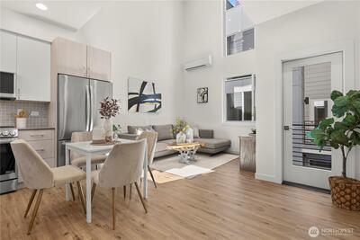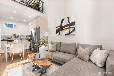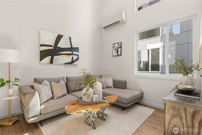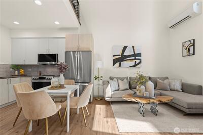 Discover the modern luxury with Greencity’s Salish Community! This quality-built residence features a dedicated EV-ready parking space and breathtaking views of the Seattle skyline and Mt. Rainier. Thoughtfully designed for both style and functionality, the expansive sun-filled great room showcases soaring 18-foot ceilings and flows seamlessly into a sleek chef’s kitchen with stainless steel appliances and contemporary finishes. The top-floor primary suite offers a serene retreat with a spa-inspired bath, while the second bedroom with its own private bath provides comfort and privacy on the lower level. A versatile mezzanine level adds flexible space—perfect for a home office, lounge, or creative studio. Stay comfortable year-round with high-efficiency mini-split heating and A/C. Unit features several private balconies, complemented by a fenced outdoor patio and additional storage accessible from the lower floor. The experience is crowned by a spectacular rooftop deck, ideal for