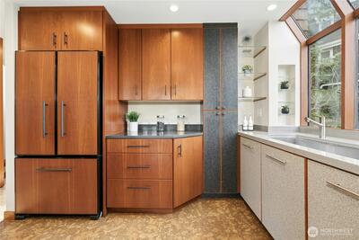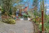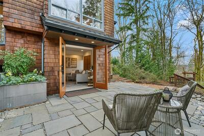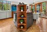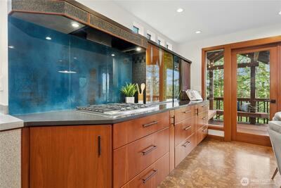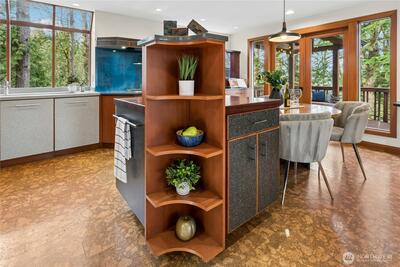 Tucked gracefully among the evergreens of Squak Mountain, this custom-built, treehouse-inspired residence offers an extraordinary sense of retreat just moments from downtown Issaquah. With 3 bedrooms, 2.25 baths, and 1,980 square feet, the home is defined by soaring ceilings and dramatic walls of windows that invite in natural light and tranquil forest views at every turn. Rich, organic finishes - shingle siding, clear fir six-panel doors and detailed millwork, tile and cork flooring - create a warm yet refined Northwest aesthetic.The signature kitchen, thoughtfully designed by Richard Landon, blends artistry and function with premium Brazilian cherry cabinetry, a substantial island, and custom-made glass door accents. French doors open to a wisteria-draped deck, an enchanting setting for quiet mornings or elegant summer gatherings.A matching detached outbuilding provides versatile space for a private office, studio, playhouse or extra storage. Lush landscaping, Pennsylvania Bluestone