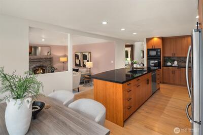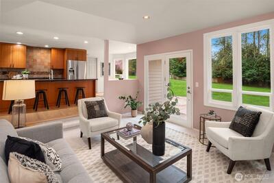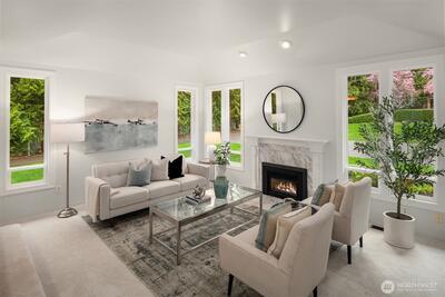 Situated on a rare, level and fully fenced shy acre in Woodinville’s coveted Hollywood Hill neighborhood, this beautifully maintained 4-bedroom home offers a blend of space, comfort, and thoughtful design. A circular drive framed by blooming cherry blossoms creates a striking first impression. Inside, the home opens to a light-filled living room with walls of windows and a marble-surround fireplace, flowing seamlessly into a formal dining room ideal for entertaining. The remodeled kitchen, with custom cabinets and a gas range, sits at the heart of the home, featuring a huge island with a breakfast bar, an eat-in kitchen nook, and an oversized pantry. The family room with a wood-burning fireplace opens to the expansive stamped patio, ready for your summer BBQ's. The main floor primary suite has a spa-inspired bath with a relaxing soaking tub, a slate tiled shower, a huge walk-in closet and a new vanity with a backlit mirror. The upper level features a bonus room, 3 bedrooms, and an up