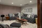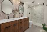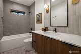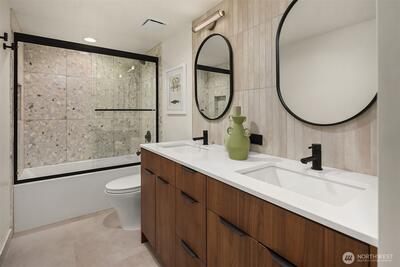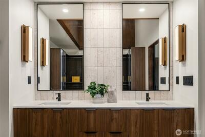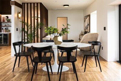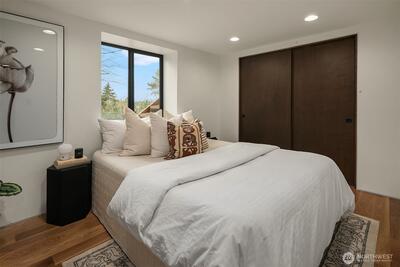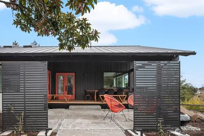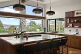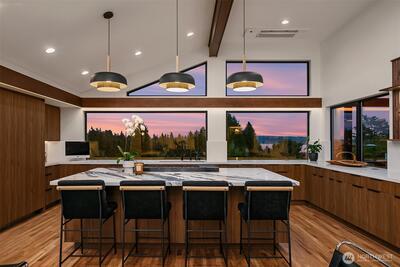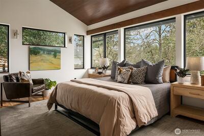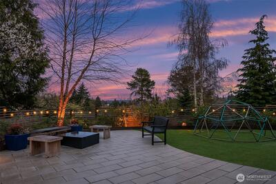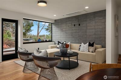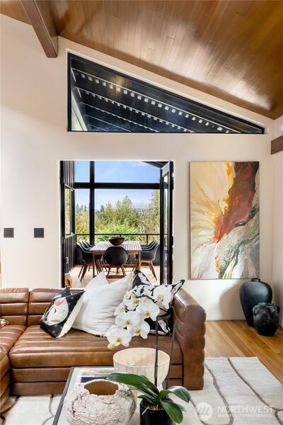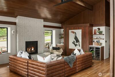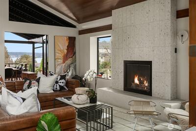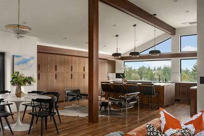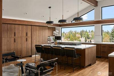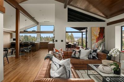 A showstopper in Laurelhurst. This designer-owned Mid-Century Modern has been completely reimagined with an uncompromising eye for detail. Taken down to the studs and effectively rebuilt, every inch reflects elevated craftsmanship, from the striking new exterior with hand-troweled stucco, metal roof, and modern landscaping, to the refined, gallery-like interiors spanning nearly 4,000 square feet. Inside, iconic original clear fir ceilings meet Calacatta Gold marble slab, real terrazzo tile floors, in-home finished hardwoods, and walls of custom cabinetry. Trim-less walls, windows, and doors create seamless lines, while statement designer lighting and a glass-cabinet dressing room deliver a level of design rarely seen. Set on an oversized triangular lot, the property captures Lake Washington views and resort-caliber outdoor living with artificial turf, a built-in hot tub, and a pergola perfectly positioned towards the Lake. The lower-level guest apartment with a separate entry features