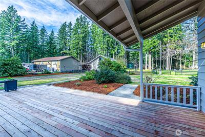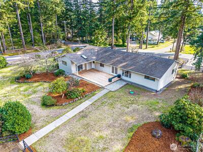 Enjoy space and privacy with this turnkey rambler on a nearly one-acre corner lot. This 2,020 sq ft home features brand-new flooring throughout, three beautifully remodeled bathrooms, new lighting, tile, doors, stainless steel kitchen appliances, and fresh interior and exterior paint. The light-filled floor plan offers three spacious bedrooms, including two with attached bathrooms. The primary suite opens directly to the deck for easy indoor-outdoor living. Enjoy multiple living spaces including a formal dining room with sitting area, living room, and rec room—all on one level. Step outside to a brand-new deck overlooking the landscaped yard and garden area. The property also includes a two-story shop with loft, storage rooms, and covered space—offering versatile options for hobbies, projects, or storage.