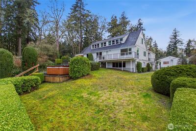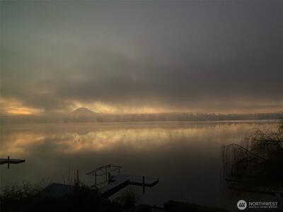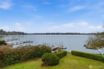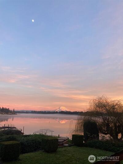 Gorgeous American Lake Waterfront Parcel with two homes on it! Value is in the land and rental income while remodeling or tearing down the original home in average condition. Amazing, sunny southward facing approx. 120 ft of no bank lakefront with a dock! The sprawling home has over 4100 sq. ft. of space, with views from all the main rooms across the home facing south, as well as a nice deck & large patio overlooking the lake and lovely Mt Rainier views. Large rustic beamed living room, white kitchen, bonus family room and the primary BR make up the main floor. Upstairs is two generous bedrooms & a bath, plus an unfinished space that could be another bath? Downstairs boasts the 4th BR, a spacious rec room & another 3/4 bath. Just past the deck is the large lawn leading down to the no bank gravel beach, dock and storage cabana near the shore... it's dreamy! There's a two car carport, an upper garage that is currently a shop, and a lower garage on the east of the home. There is separate
