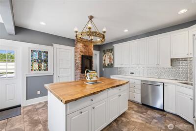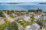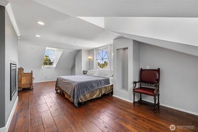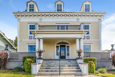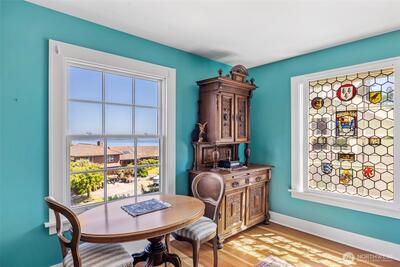 Rising above Commencement Bay in North Tacoma, the iconic Gray Mansion blends historic grandeur with refined modern updates. Built in 1906, this remarkable residence captures sweeping water views while preserving the architectural character that defines Tacoma’s most treasured homes. The dramatic 40x18 living room features custom built-ins, a classic wood-burning fireplace, and elegant proportions ideal for entertaining. Just beyond, the formal dining room continues the home’s timeless charm. The beautifully updated kitchen pairs historic character with modern luxury. Rich cabinetry, granite countertops, a Sub-Zero refrigerator, and a stunning La Cornue range create a chef-worthy space. Rare 18th-century stained-glass windows frame the range, adding a one-of-a-kind architectural centerpiece. The second floor offers three bedrooms, two bathrooms, and convenient laundry. The third floor provides a private retreat with a bedroom, living area, bath, and 360° views across Commencem