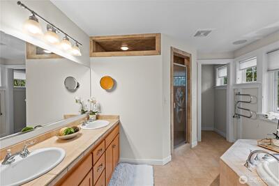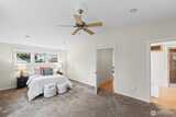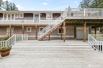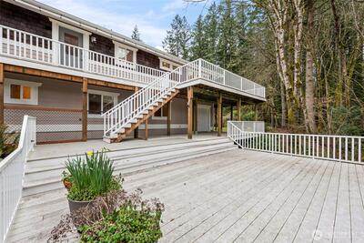 Welcome to peaceful living in the heart of Gig Harbor. Set on five private acres, this warm and inviting 2,737 square foot home offers the perfect blend of space, comfort, and functionality. The traditional design creates a timeless feel, while thoughtful updates throughout provide modern ease. Inside, beautiful hardwood floors reflect abundant natural light, creating a bright and welcoming atmosphere. The main-level primary suite feels like a retreat, offering privacy and sunshine throughout the day. Generous living spaces flow easily for everyday living or gathering with guests. Downstairs, an expansive bonus area offers incredible flexibility for a media room, home office, gym, or additional living space. Step outside to the oversized wraparound deck, an ideal setting for morning coffee, evening dinners, or simply enjoying the quiet beauty of your surroundings. The detached garage and shop add tremendous versatility, featuring an RV pull-through door, hookups, and a convenient three