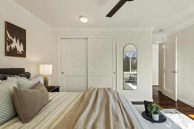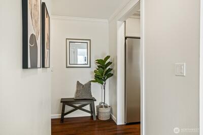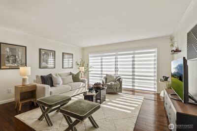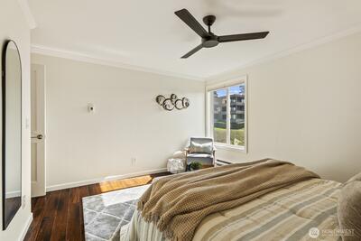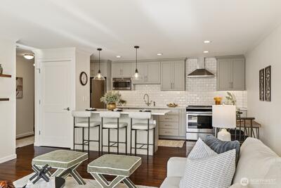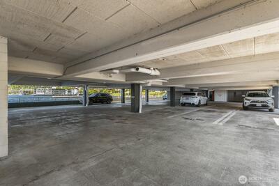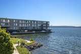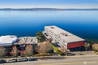 Luxury meets lifestyle in this sleek, modern top-floor 1BR residence overlooking Lake Washington. With no unit above, enjoy added privacy and peaceful living while taking in sweeping views of the water, city skyline, and Olympic mountains.Inside, the open-concept layout is enhanced by rich ebony bamboo flooring, quartz countertops, stainless steel appliances, and in-unit laundry with generous storage. The living room and bedroom features sliding windows with ½"thick Low-E laminated glass for enhanced heat efficiency, along with a Phantom retractable screen for an unobstructed and clear view of the lake. In the bedroom, blackout shades create a restful, light-controlled retreat.Secure main-floor entry, elevator and reserved covered parking add everyday convenience. Just moments from downtown Kirkland, waterfront parks, dining, shopping, and major employers like Google, Meta, Amazon & Microsoft.With an attached dock and direct lake access just steps from your residence, this move-in rea