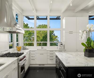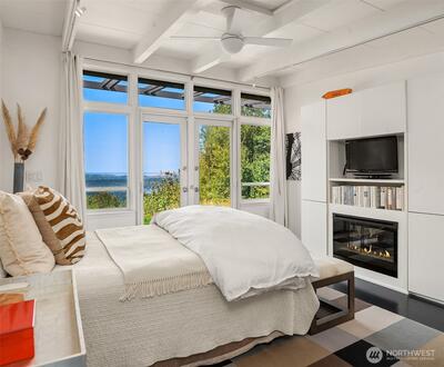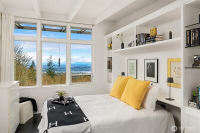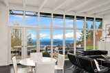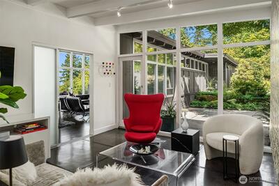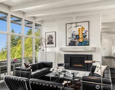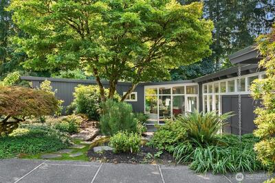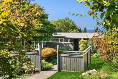 Mid-Century Modern Designed by Roland Terry this rare architectural one level home is in the secluded Hilltop community founded by renowned UW architects. Situated on a private lot of 31,500 sq ft, west facing, offering spectacular views of Lake Washington, Puget Sound, Seattle Skyline & Olympic Mountains. This home highlights iconic mid-century modern style with floor to ceiling windows, thoughtfully updated, including plumbing, electrical + windows. Chef's kitchen features Calacatta marble island, quartz countertops & stainless-steel appliances, two bedrooms with den/sunroom/third bedroom. Serene primary suite with expansive view, fireplace, spa bath and walk in closet. Spectacular west facing patio, surrounded by landscape with lush native plants. Your ownership allows access to acres of shared greenbelt with walking trails, a swimming pool, tennis court, sport court, and a strong sense of community.